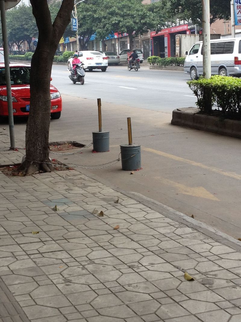 在西環路的公共停車位上,有商家用鎖鏈把水泥墩鎖在樹木上。
