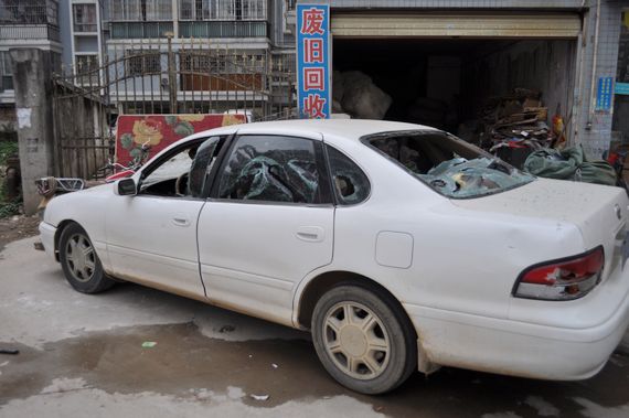 被砸的白色小車前后門及后面玻璃全部被砸碎,左后門玻璃碎裂成蛛網狀,向車內凹陷。