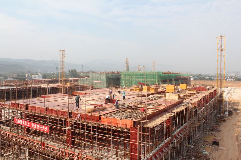 ??? 11月17日,在岑溪市澤仁現代商貿物流城施工現場,工人正鋪設樓面模板。