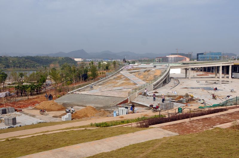 ?11月18日,施工人員在鋪設玫瑰湖特色街天面通道通往地層的地磚。目前,包括特色街在內的玫瑰湖公園景觀提升工程進入后期施工,特色街天面通往花仙子廣場和親水平臺的通道已經完成鋪設。 西江都市報記者 蒙紹松/攝