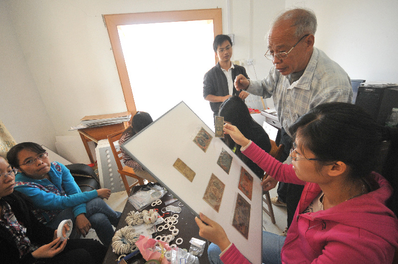 梧州學院的學生協助余老制作錢幣展板。在布展過程中,同學們學到了很多古錢幣知識。