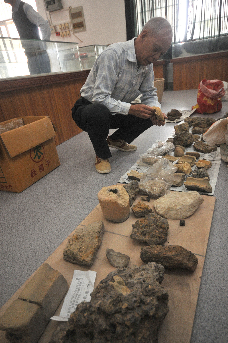余老在展館內整理陶罐碎片。這些陶罐碎片在余老眼里都是寶貝,它們是元豐監遺址出土的陶罐碎片,極具考古價值。 |