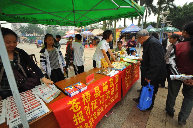 ????11月24日,梧州日報社發行部、《西江都市報》編輯部、蒼梧縣郵政局聯合在龍圩區世紀廣場舉行“讀者面對面”活動。西江都市報記者 何鎏/攝
