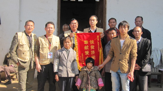 在小俊峰的求醫路上,得到了許多好心人的幫助。圖為覃超全一家正在接受捐助。(前排女孩為小俊峰的妹妹覃柱燕)