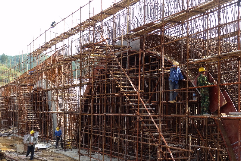 ????近日,工人正在對已完成鋼筋構(gòu)筑的蒼海湖跨湖景觀橋橋拱安裝模板。