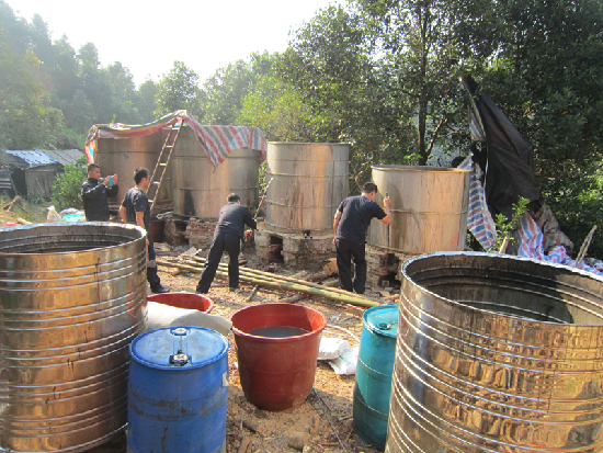 ????今年11月初,藤縣公安局掛村民警在進(jìn)村走訪群眾時(shí),獲取一條重要線索——在藤縣平福鄉(xiāng)空垌村附近的山林里,有兩名陌生男子搭棚子“煎熬中藥”,氣味十分難聞。根據(jù)線索,轄區(qū)派出所立即開(kāi)展調(diào)查走訪工作。隨著摸排工作深入,平福鄉(xiāng)男子王×進(jìn)入警方視野。民警發(fā)現(xiàn),王×經(jīng)常與該縣太平鎮(zhèn)的男子吳×來(lái)往甚密,經(jīng)常一起駕駛摩托車往平福鄉(xiāng)空垌村附近的山里。民警立即對(duì)該片山林進(jìn)行細(xì)致摸排,一個(gè)隱秘的制毒窩點(diǎn)很快浮出水面。原來(lái),王×、吳×為了躲避警方的打擊,竟然密謀在平福鄉(xiāng)偏遠(yuǎn)的山林里偷偷搭建工棚進(jìn)行制毒。