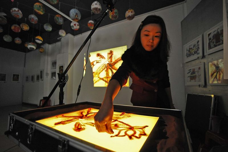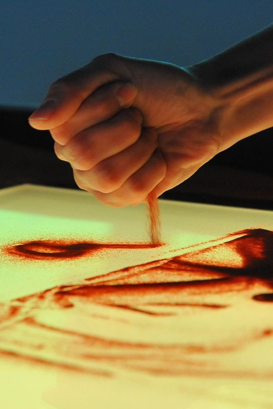 沙畫是傳統(tǒng)美術(shù)和現(xiàn)代聲光錄影技術(shù)的結(jié)合,表演者需要在專用的背光沙臺上以光作畫,用錄影設(shè)備拍攝,并在音響效果襯托下,用投影播放表演情景。