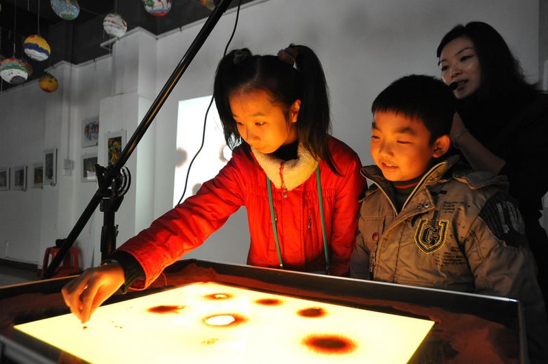 手握細(xì)沙,稍微松拳讓細(xì)沙緩緩漏下,一個(gè)小太陽便誕生了。但是這個(gè)簡單的圖案對于12歲的蘇芙來說有一定難度,“看老師示范很簡單,但到自己體驗(yàn)時(shí)才發(fā)現(xiàn),要控制好手中沙子的量并不容易,一旦把握不好,就會(huì)毀掉這個(gè)圖案。”