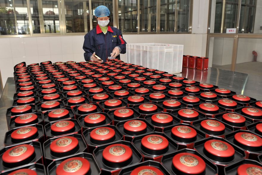 ?12月11日,在梧州市天譽茶業有限公司車間,員工正包裝六堡茶。