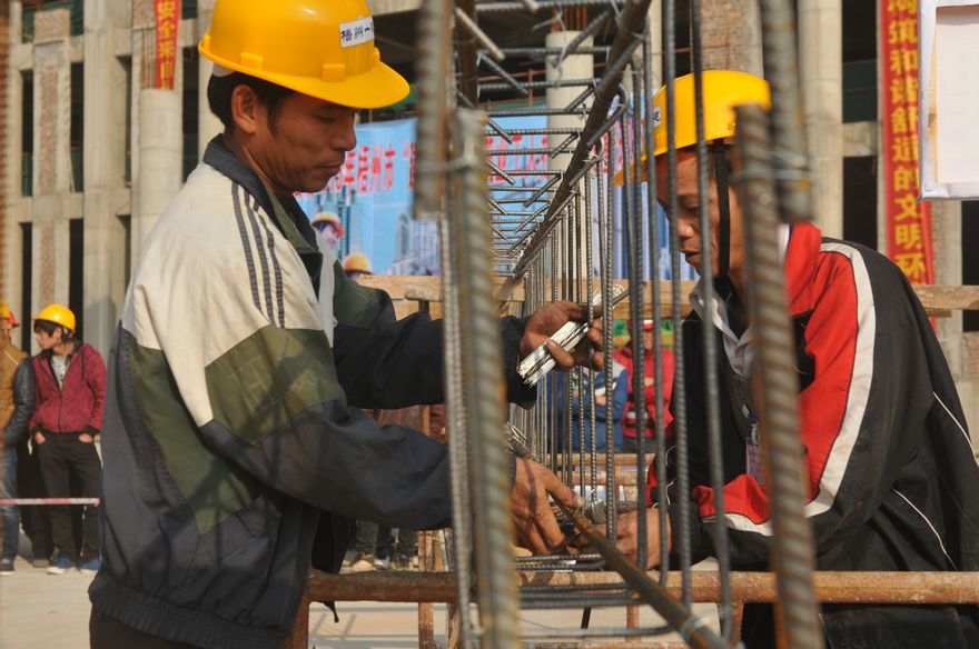 12月20日,梧州一建的建筑工人在比賽中捆扎鋼筋。當天,梧州市首屆建筑業工人技能大賽暨現場觀摩會在三龍大道正在建設的紅嶺大廈工程項目部舉行,來自梧州市6家建筑企業的24名建筑工人進行了捆扎鋼筋、砌磚等技能比賽。 記者 蒙紹松/攝