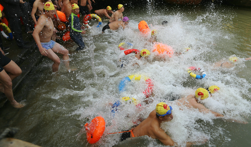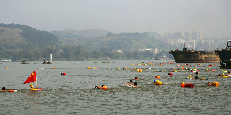 ????12月21日上午,游泳健兒在藤縣競技橫渡潯江。