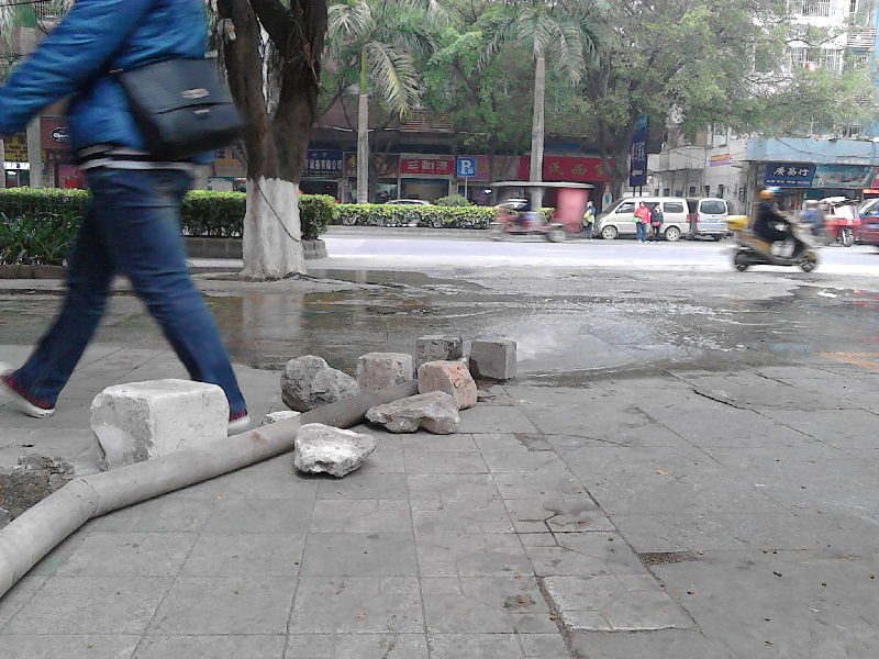 ????12月18日中午,記者現場看到,為了固定排水管,水管被七八塊水泥方左右固定,最大一塊水泥方高過嬰兒膝蓋,過往路人無不小心翼翼。一位腿腳不方便的阿婆,跨過水管時候猶如電影“慢動作”一樣。