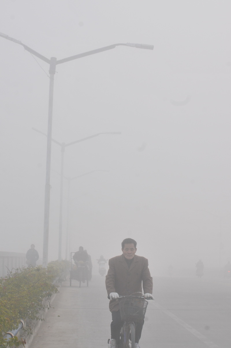 當(dāng)日早上,人們在大霧中騎車經(jīng)過桂江二橋。