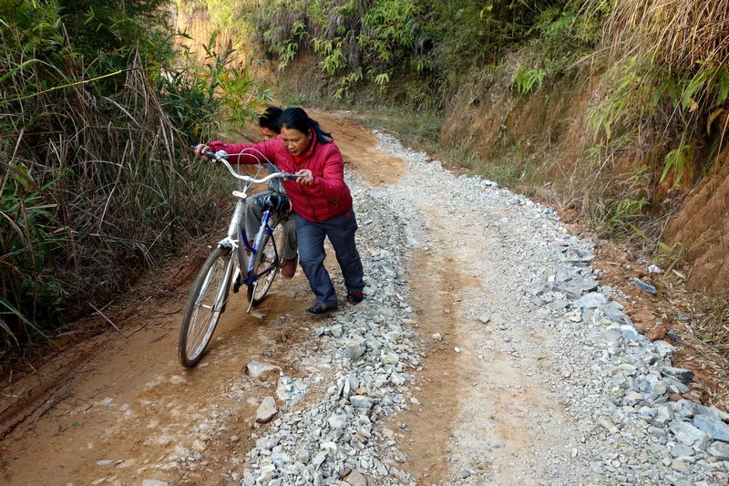 上學路上,歐少方用自行車推著兒子,在滿是碎石、沙子的土坡上艱難前行。