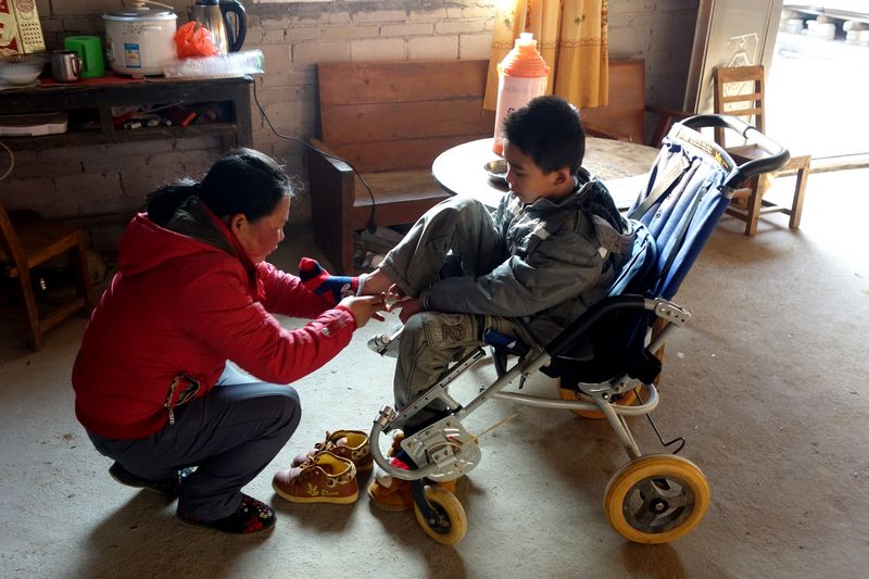 ??? 他,交叉著雙腿,僅靠雙手的支撐,勉強能把身子從被窩挪到床邊。掛在木椅靠背的衣服離他只有一臂之遙,行動不便的他,卻只能通過一旁的母親代勞。在穿衣的過程中,衣服的袖子會被腫大的關節卡住。只要稍加用力,他母親的臉上就會流露出難受的表情。