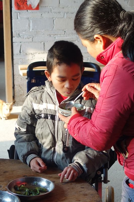 ????歐少方小心翼翼地把兒子從床上抱起,并移至床邊的輪椅上。此時,金雨連連叫餓。歐少方猛然想起,由于晚上照顧兒子到深夜,自己忘了提前煮好早上兒子要吃的粥。按照均平小學的要求,學生要在8點20分到達學校。眼看時間不夠用,歐少方趕忙跑到鄰居家,去要點粥給兒子吃。