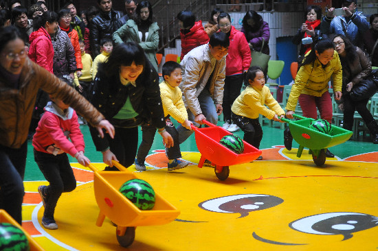 ????12月28日,在親子健身活動中,小朋友和家長一起完成推車比賽。