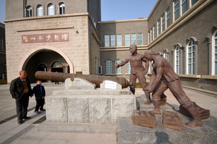 ?12月30日,市民在觀看梧州市博物館門前古炮發(fā)射的情景雕塑。市博物館門前展覽的古炮新增的一組情景雕塑在近日完成,向觀眾再現(xiàn)了古炮發(fā)射的情景。 西江都市報記者 蒙紹松/攝