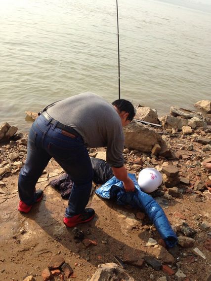 渾身濕透的救人小伙子蔣龍華回到岸上拾取脫下的外套和安全帽。紀(jì)榮蘭/攝