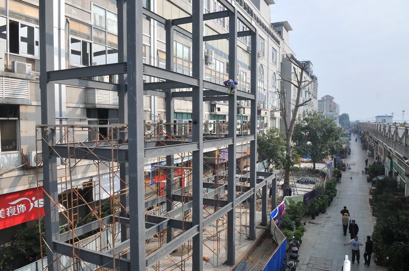 ??? 2014年1月2日,在鴛江麗港花鳥街,工人正搭建商鋪的鋼結構。