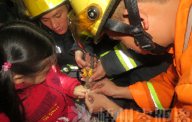 經過5分鐘的路途達到現場后,指揮員詢問其家人具體情況,孩子媽媽詳細的講述了事情的原由。晚上給孩子洗澡的時候發現手指上面有一個東西卡住了,怎么取也取不下來,一問小孩怎么套在手指上面的,早上在學校讀書的時候就已經被卡住了。由于時間長,墊片卡在了關節處,血液不暢通,慢慢地就開始紅腫,疼痛,小孩一直哭個不停,無奈之下就只好求助消防官兵了。指揮員握著小女孩的手進行觀察,是一個螺母墊片死死的卡在中指上,使手指無法動彈。指揮員果斷下命令,拿出一個礦泉水瓶,用剪刀剪出一塊條狀,墊在手指上面,防止施救過程中造成二次傷害,再利用多功能剪對墊片進行剪切。整個過程不到1分鐘,就成功將小女孩手指上面的墊片取出,小女孩沒有受到任何的傷害。