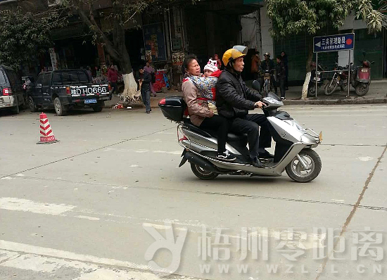 1月6日,在龍圩區糖廠路口,路面的斑馬線已模糊,摩托車超載、違法搭乘小孩的現象比比皆是。覃燕霞 攝