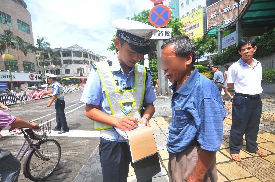 2013年7月28日,在中山崗的一個(gè)路口,交警對(duì)亂過(guò)馬路的行人開(kāi)出罰單。李鴻榮/攝