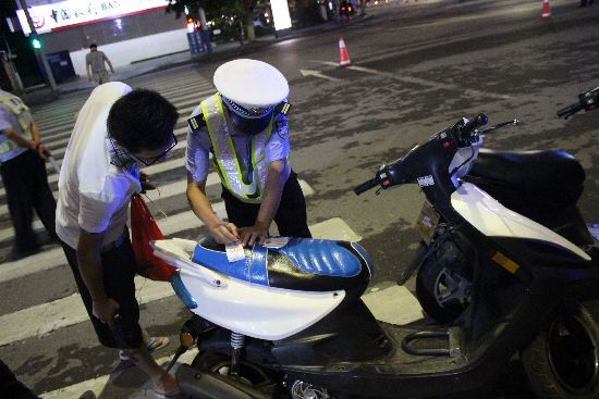 2013年7月15日晚,梧州市公安部門(mén)在文瀾路口設(shè)卡,整治涉嫌改裝的助力車或摩托車。 董宏偉/攝
