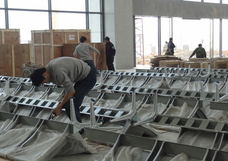?1月11日,南廣鐵路梧州南站候車大廳,工人正安裝不銹鋼椅子。