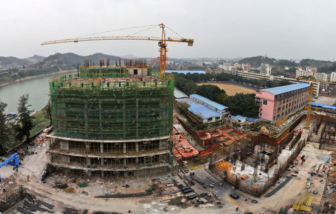 ???? 1月13日下午,在萬秀區錢鑒二橋安置房項目工地,施工人員、機械正忙碌地施工。