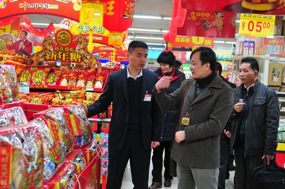 ??? 預防節前市場價格異常波動 多部門聯合檢查市區商品服務價格 記者 李欣鞠 1月15日,在南城百貨錦泰店超市,聯合檢查小組成員檢查超市商品銷售價格。李煜榮 攝