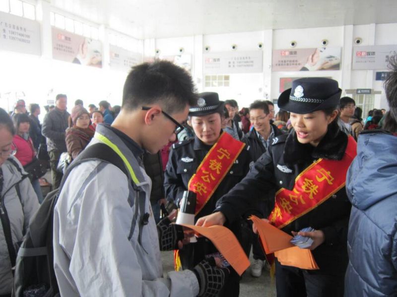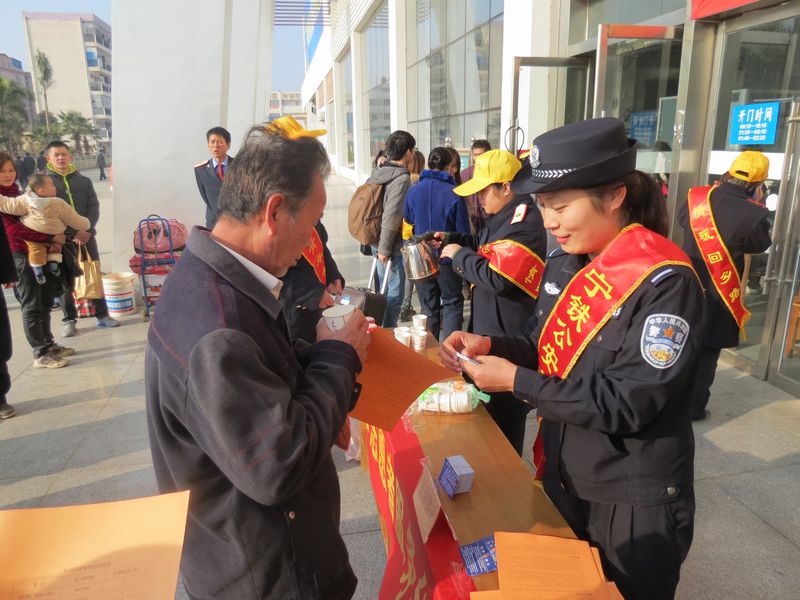 ????當(dāng)天,在梧州火車站民警為旅客群眾提供溫馨法律咨詢,同時設(shè)置青年志愿者服務(wù)臺,根據(jù)旅客群眾的需要,為他們免費(fèi)提供熱開水、鐵警提示、防盜知識宣傳單等,為旅客出行提供優(yōu)質(zhì)安全、方便地服務(wù)。