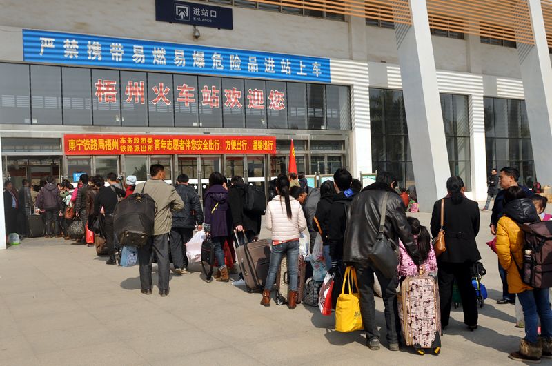1月16日是2014年春運首日,等候進站的旅客在梧州火車站候車大廳前排起了長龍。隨著馬年春節臨近,鐵路客流出現逐漸增多的趨勢。 西江都市報記者 蒙紹松/攝