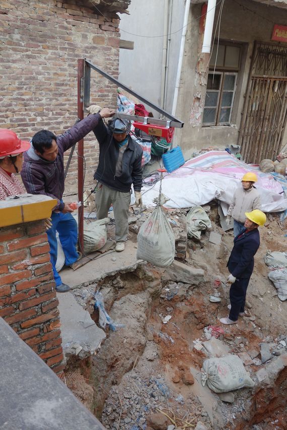 ?施工人員正用“電動葫蘆”運送塌方產生的垃圾。記者 龍天傳/攝