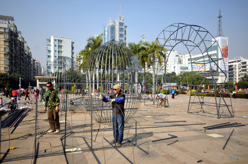 ??? 1月19日,工作人員在市政廣場焊接迎節(jié)景致的鋼筋結(jié)構(gòu)。2014年春節(jié)臨近,梧州市政部門開始在市區(qū)部分地段布置迎節(jié)景致,為春節(jié)期間營造喜慶的節(jié)日氣氛。 西江都市報(bào)記者 蒙紹松/攝
