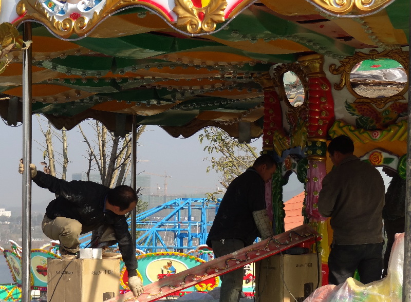????1月15日,在玫瑰湖公園游樂場A區,工人正安裝各種游樂設施。