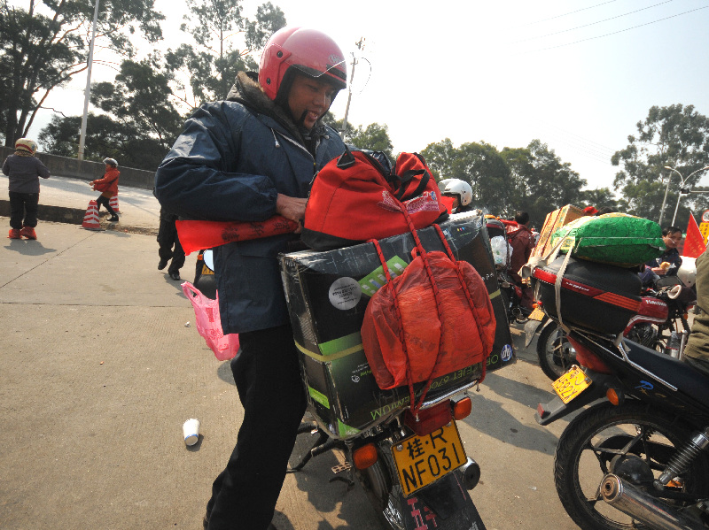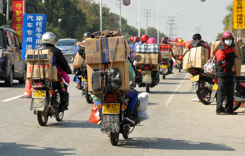 ????小狗、空油瓶、塑料桶……在返鄉務工人員的摩托車后座,還有很多別樣的行李。