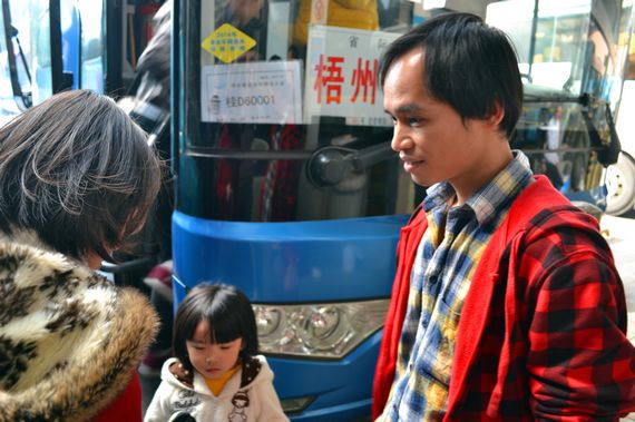 返回梧州的客車即將出發,小鄭竭力裝出輕松的樣子與情緒低落的妻子和女兒分別。