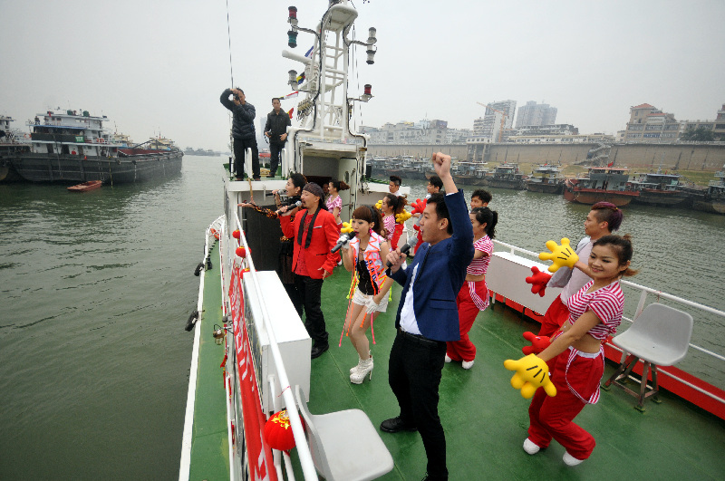 ??? 昨日下午2時許,西江梧州段的江面傳來陣陣歡快的歌舞聲。這是一場由梧州市市委市政府主辦,梧州市市委宣傳部、梧州市海事局和梧州市文化新聞出版局共同承辦的“情暖西江”——梧州市西江航道文化惠民演出活動,為的就是讓在梧州滯航的船只能夠感受到暖暖的新春問候。 西江都市報記者 謝韻/文 蒙紹松/攝