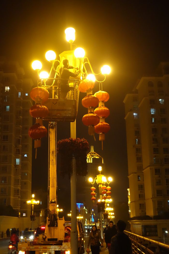 ?1月26日晚,梧州市路燈管理處正在抓緊時間,為桂江一橋掛上一串串紅燈籠。