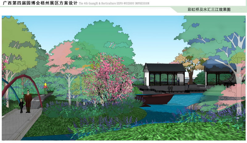 ????作為展園的中心——“長洲島”,將引入展園的江水一分為二。其中一道江水通過“長洲水利樞紐內江大壩”匯集在展園中心,形成一片“湖”面,湖邊則是具有嶺南風格的親水涼亭、飽含民俗氣息的水上人家建筑和禮艇。另一道江水經過“長洲水利樞紐外江船閘”后,流過一條小拱橋。最后,在“鴛江大橋”下,兩條江水匯集,流入園博園的水系中。該處造景真切地模擬了桂江、潯江在梧州鴛江大橋附近交匯,形成滾滾西江向東流去的畫面。