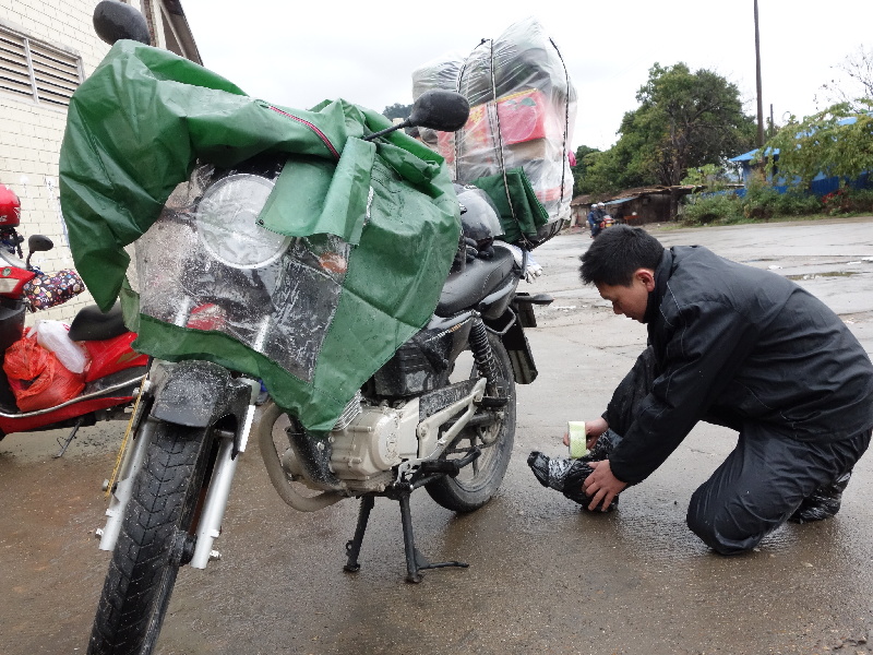 ????2月9日,在南岸火山加油站,一位駕摩托車返程務工者在進站休息時,用透明膠帶包裹褲腳和鞋套以防風防水。 祝琳 攝