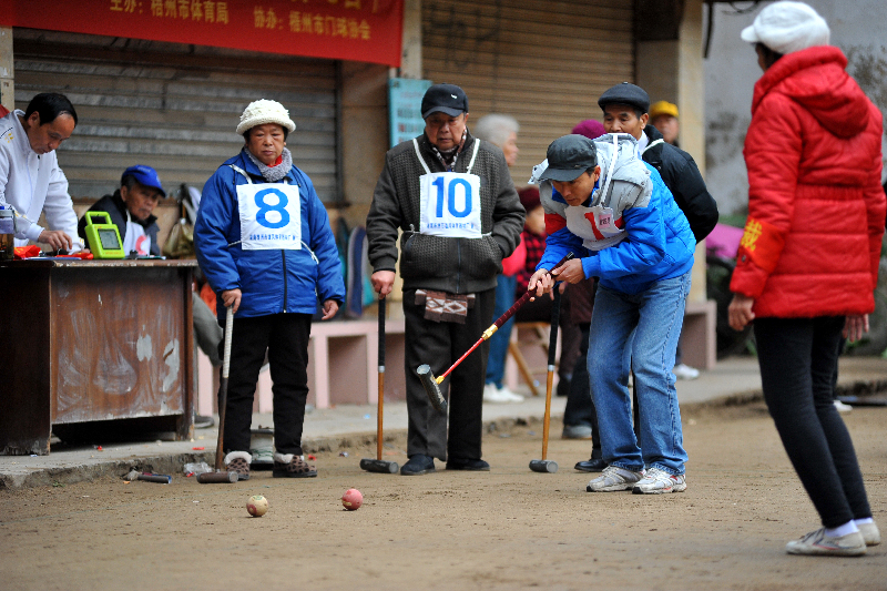 ??? 2月9日,參賽隊員在比賽中擊球。當日,為期兩天的2014年賀歲杯梧州市門球比賽在梧州市體育局綜合訓練場鳴金收兵,參加比賽的15支隊伍順利決出名次。西江都市報記者 何鎏/攝