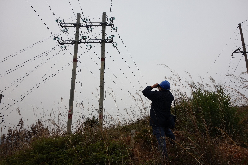 陳哲用望遠鏡仔細觀察電桿上的瓷瓶情況。