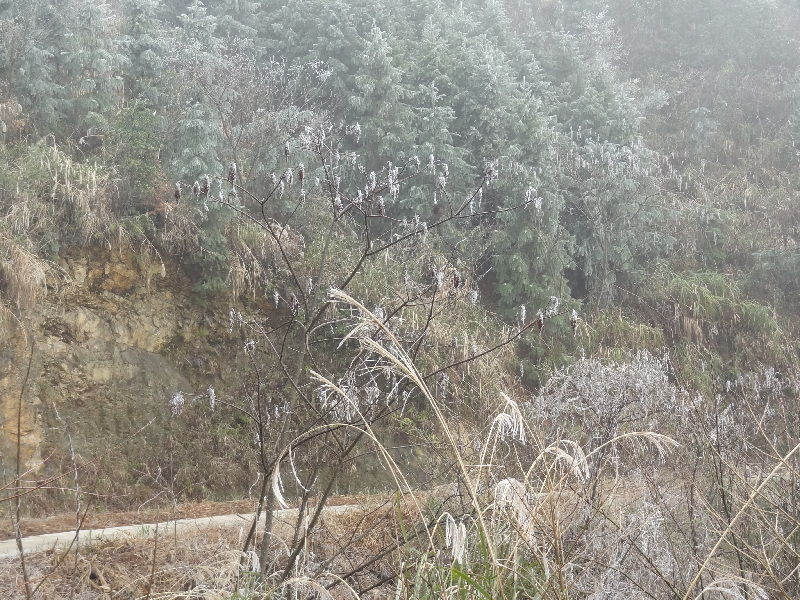 ????2月13日早上,在蒙山縣北部地區的鄉間小道,沿路兩旁不少植物都結滿冰掛。