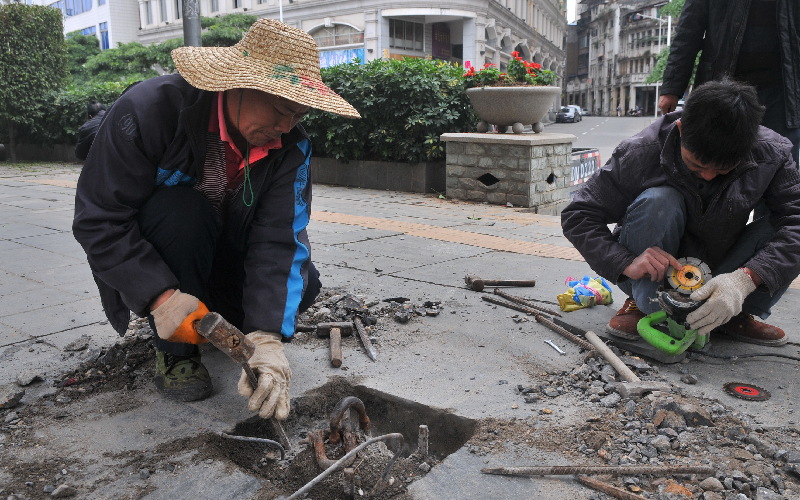 ????2月26日,在西江一路,工人正在更換地面的閘門鐵環(huán)。