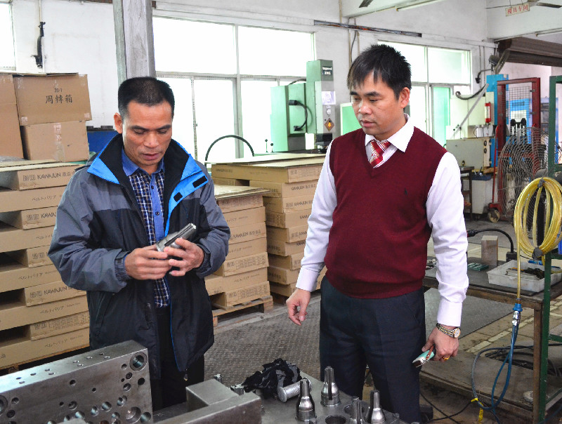 ????2月23日下午,在深圳金比勒科技公司內,覃志彬與工人商討如何解決LED燈生產過程中遇到的技術問題.