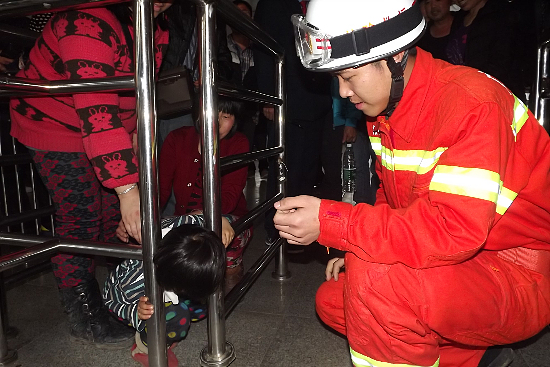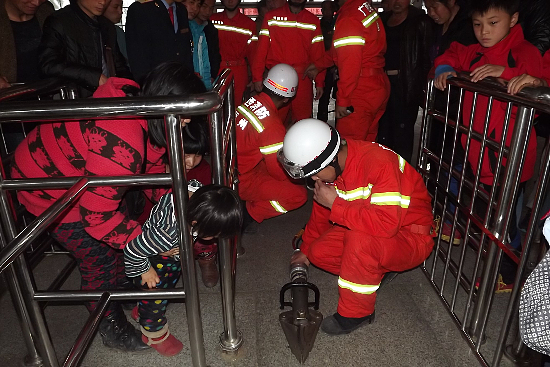 ????消防官兵到達現場后,發現小女孩頭部被卡在候車室旁欄桿上面取不下來,一旁的家長十分焦急。據家長告知:10分鐘前,媽媽帶孩子在候車室等車回家,女童因為頑皮跑到欄桿處玩,一不小心把頭卡在欄桿處拿不出來,無奈之下只好求助消防官兵。了解情況后,為了避免在救援過程中對小女孩造成傷害,救援行動分兩組迅速展開:第一組官兵負責疏散圍觀群眾以便施救過程順利進行;在穩定被困者情緒的同時,另一組官兵則手持液壓擴張鉗進行擴張作業。經12分鐘緊張的細致的救援,女孩被成功救出,化解了一場危機。