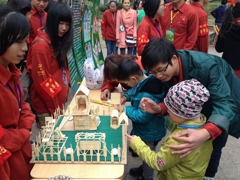 ????在梧州學院的環保宣傳攤位,志愿者們剛把精美的環保作品擺在桌上,便有好奇的小朋友圍了上去。他們仔細打量著這些用竹筷子做成的“房子”,用紙張做成的“孔雀”,還有用易拉罐拉環做成的“臺燈”,驚嘆不已。志愿者們見狀便親切地彎下身子,手把手地教他們如何制作環保手工品,并向小朋友們宣傳環保觀念。
