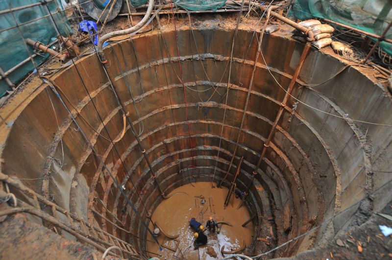 ??? 3月6日,在富民一路,工人正在井下鋪設排水管。